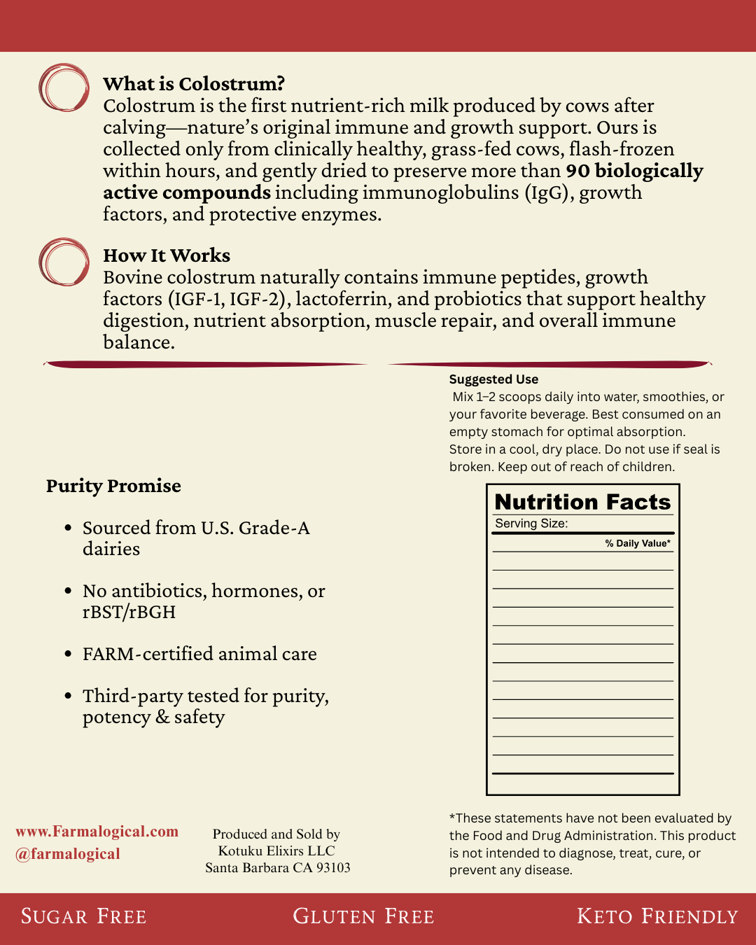 Our bovine colostrum is sourced exclusively from clinically healthy, pasture-raised cows and collected only from the first and second milking, when immune factors are at their peak. It is gently processed to preserve its natural bioactive compounds, offering whole-body nourishment rooted in thousands of years of traditional use.